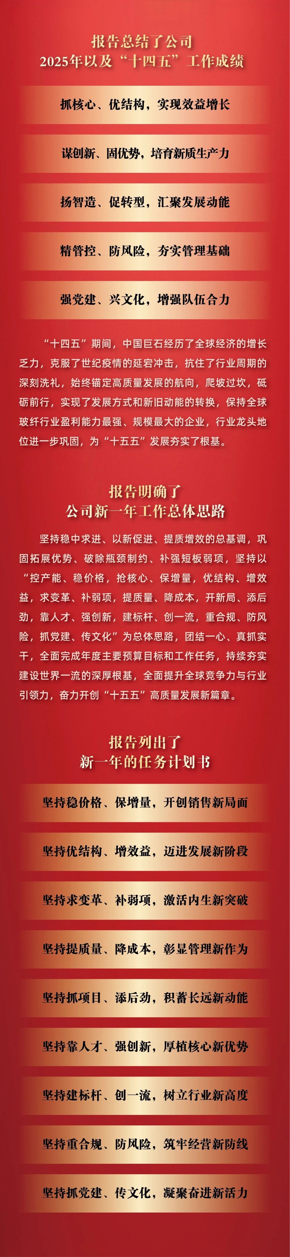 讲话指出,2025年中国jc710公海赌船全面超额完成了各项年度经营目标,进一步巩固提升了领导地位与领先优势,市场地位持续领跑,全球运营韧性凸显,科技创新捷报频传,发展根基更加稳固,内部活力不断增强。讲话提出迈向“十五五”新征程,一是锚定玻纤,专注深耕核心主业,进一步铸牢领先优势;二是强化创新,深化双链融合,大力发展新质生产力;三是胸怀世界,三化并进,推动价值提升;四是通过四能护航,汇聚全员力量,激发组织活力。
